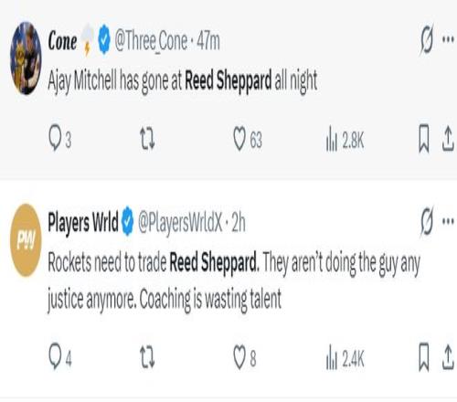 随后火蜜转推后写道:谢泼德应该被交易出去,为什么我们还要回避这个话题?说出来吧哥们儿,谢泼德需要被交易,他在场上毫无价值,而且他的尺寸太小各种被对手欺负。